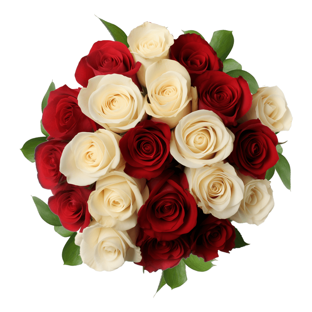 Each centerpiece is a romantic arrangement of 34 flowers. Vase not included. Each box comes with 12 elegant centerpieces and each arrangement contains; 16 stems of Red and Ivory Roses and 13 stems of Ruscus.