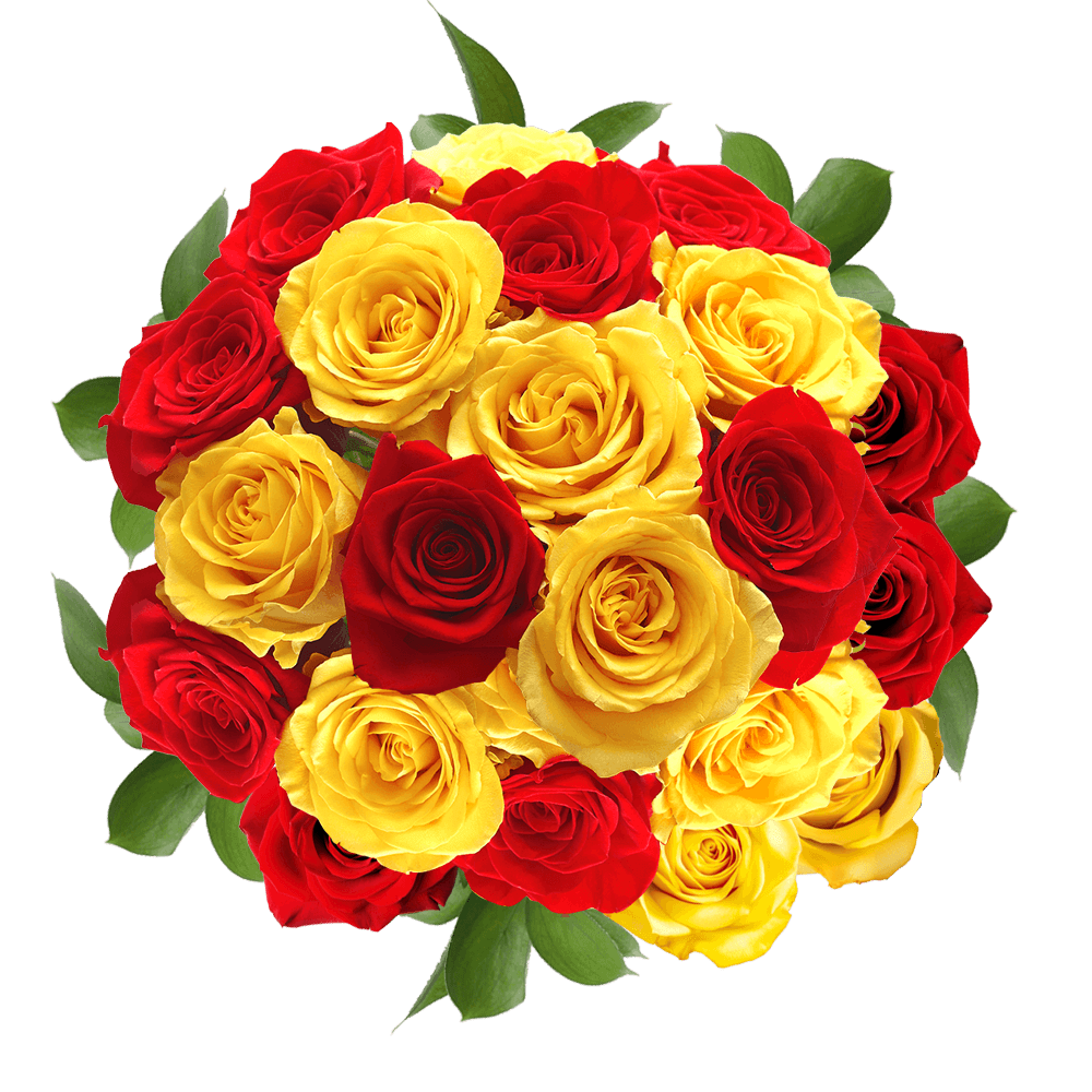 Each centerpiece is an alluring arrangement of 34 flowers. Vase not included. Each box comes with 12 terrific centerpieces and each arrangement contains; 16 stems of Red and Yellow Roses and 13 stems of Ruscus.