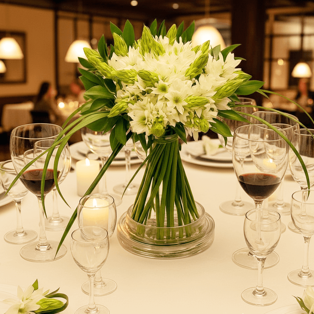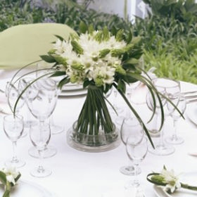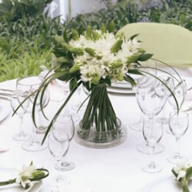 Each centerpiece is a fabulous arrangement of 43 flowers. (Vase not included). Each box contains 3 magnificent centrepieces (each arrangement contains; 18 stems of Star Of Bethlehem, 15 stems of Whips Of Lily Brass and 10 stems of Green Ruscus).
