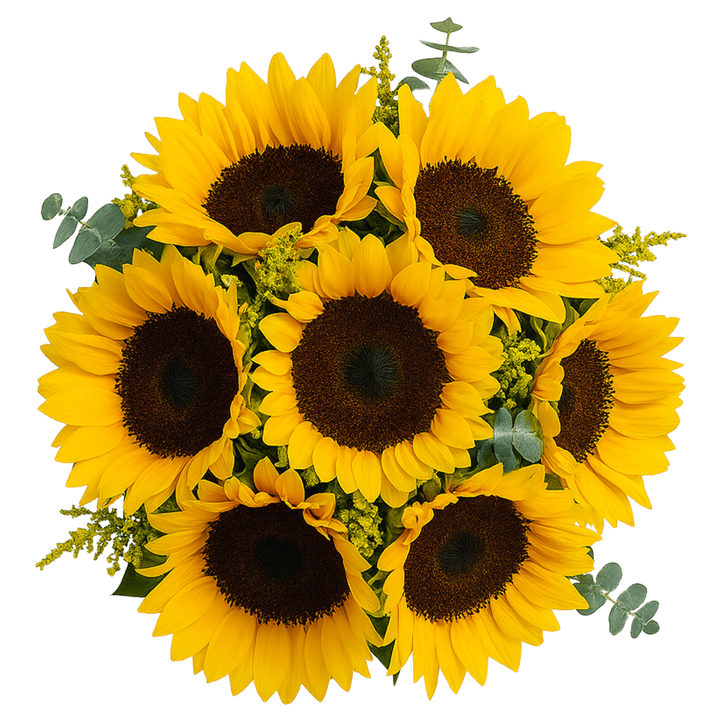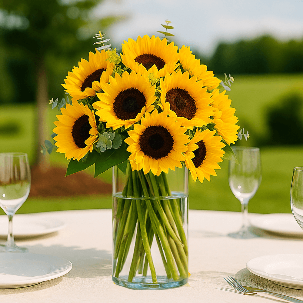 A simple beauty of elegance in this yellow sunflower centerpiece. Three centerpieces per box. The centerpiece has 16 sunflowers, 15 solidago and 6 eucalyptus. (Vases NOT INCLUDED). It is 16" to 18" tall. In all wedding/or special occasion flowers we recommend your delivery date to be two or three days before your event and to order at least 10 days before the delivery date. Your wedding flowers and wedding roses are shipped absolutely fresh, direct from the greenhouses to you via FedEx. Globalrose sells wholesale flowers and wholesale roses at prices that are usually lower than most local wholesalers. All our flowers and roses are cut specially for you, your loved one or special event (wedding, party, fundraising event, birthday or holiday), 3 days before they are delivered to your door. Color tones may vary due to the computer monitor and to Mother Nature