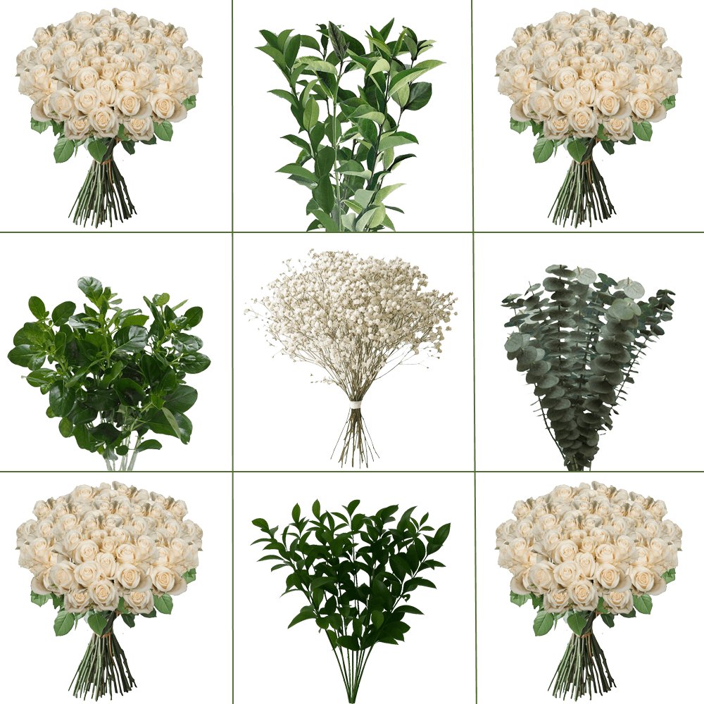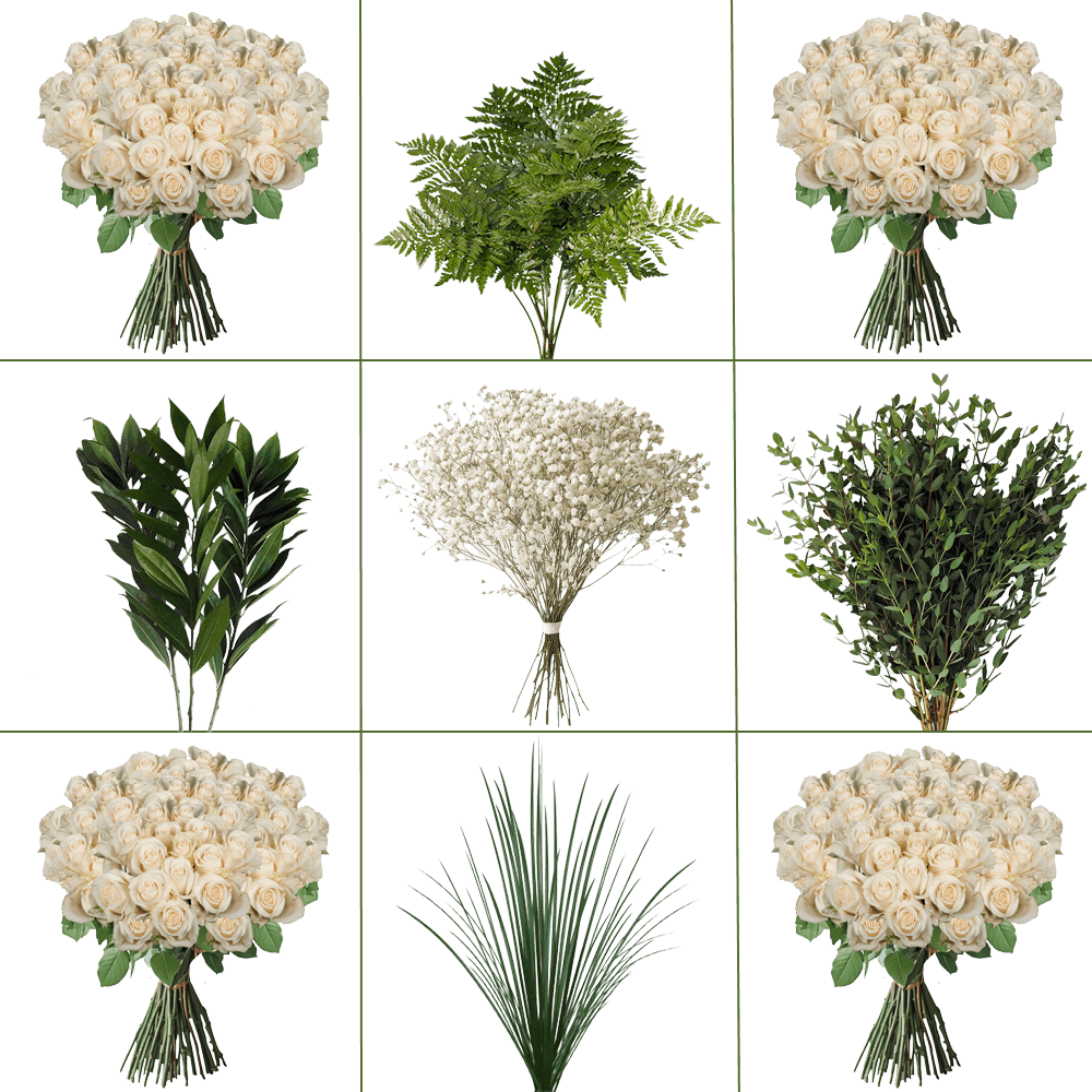 Create the wedding of your dreams with our Flawless Wedding Combo D.I.Y. Roses & Mixed Greens. This exquisite package is designed for couples who desire a personal touch on their special day. Harmoniously blend the timeless beauty of ivory roses with the vibrant charm of mixed greens to craft enchanting floral scenes that speak the language of love and romance.Imagine your guests being greeted by blooming bouquets that radiate freshness and elegance, the ivory roses standing as a symbol of purity and grace. The lush green foliage adds a natural, verdant backdrop, enhancing every setting from table arrangements to ceremonial arches. This combo brings a garden-fresh allure indoors, creating an atmosphere that captivates every heart.Our roses are freshly grown and harvested to guarantee peak beauty and longevity. With next-day delivery, you’ll have the freshest blooms ready for your creative touch. Whether it’s a grand centerpiece or delicate boutonnières, this DIY combo offers endless possibilities to express your unique style.By choosing GlobalRose, you not only subscribe to quality but enjoy the ease of free shipping, ensuring a seamless shopping experience as you prepare for one of the most important days of your life. Let this elegant assortment of roses and greens tell your love story, creating memories that last a lifetime.