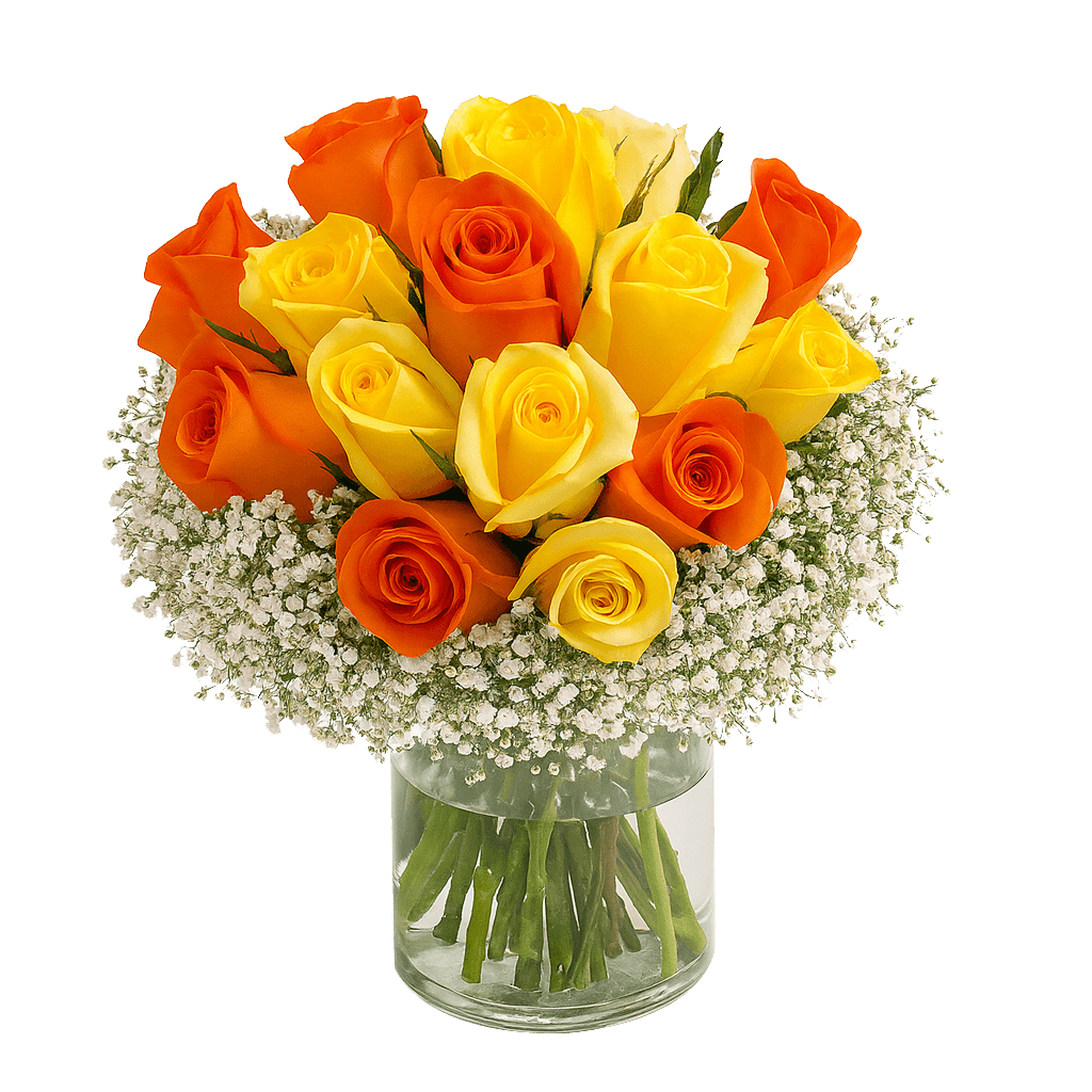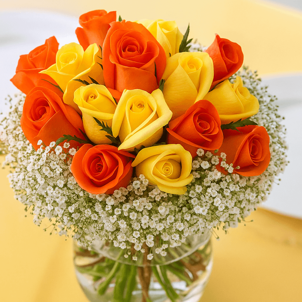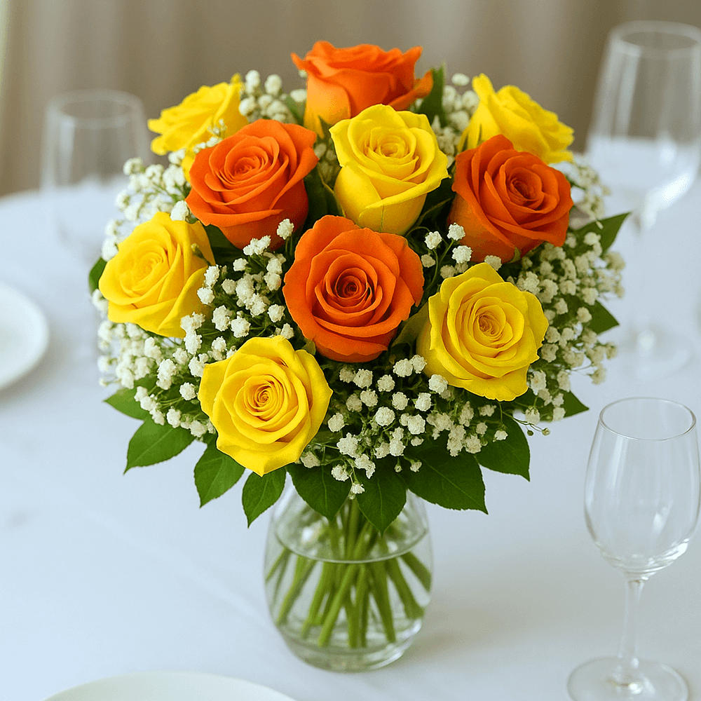 A simple beauty of elegance in these yellow and orange color wedding centerpieces. Twelve wedding centerpieces per box. The wedding centerpiece has 16 roses, and 10 gypsophilia .The roses for the wedding centerpiece are 16" to 18" tall. Vases are not included. Most wedding centerpieces should use a vase that measures 7" to 11" inches in height with an opening of 3" to 7" inches wide. You may adjust the distance across the flowers by tying the bouquet in the center or allowing it to stand on its own in the vase depending on the look you want. In all wedding/or special occasion flowers we recommend your delivery date to be two or three days before your event and to order at least 10 days before the delivery date. Your wedding flowers and wedding roses are shipped absolutely fresh, direct from the greenhouses to you via FedEx. Globalrose sells wholesale flowers and wholesale roses at prices that are usually lower than most local wholesalers. All our wedding flowers and wedding roses are cut specially for you and your special event, 3 days before they are delivered to your door. Color tones for all flowers and roses may vary due to the computer monitor and/or Mother Nature.
