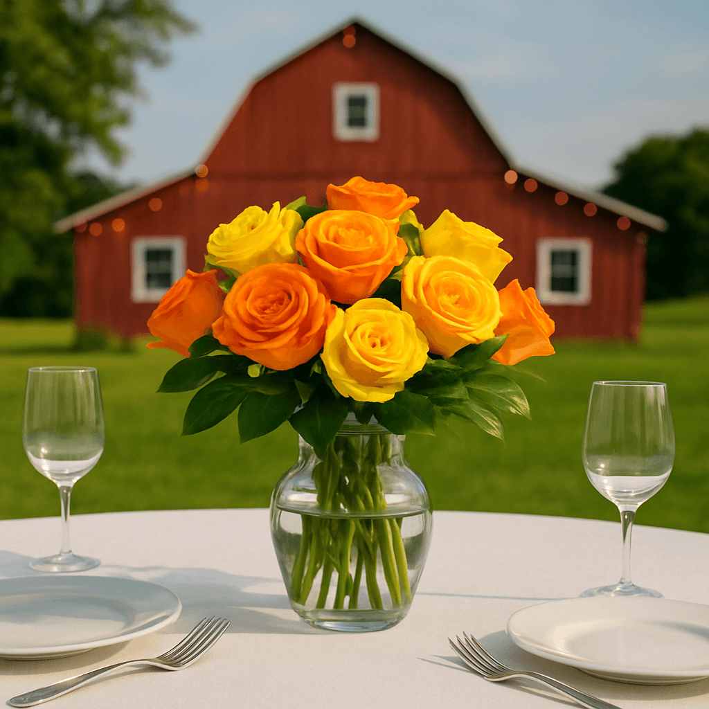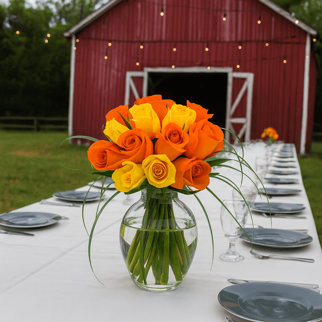 Each Rose Centerpieces is an elegant arrangement of 36 flowers. These stunning arrangaments do not include a vase. Each box contains 6 wedding centerpiece (each arrangement contains; 16 stems of Yellow and Orange Roses and 20 whips of Lily Grass).