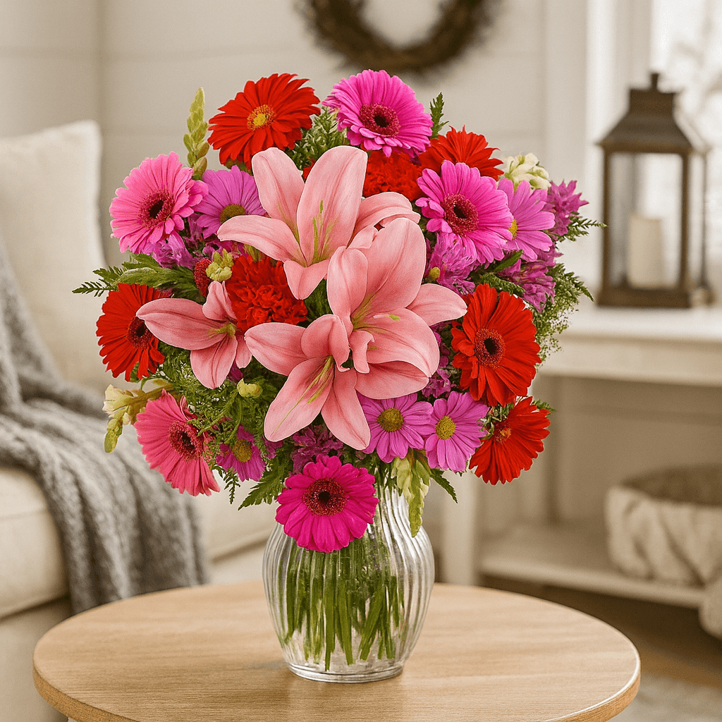 Each bouquet is a lovely arrangement of 40 flowers. Vase not included. Each box comes with 2 bouquets and each arrangement contains; 3 stems of Purple Gerberas, 5 stems of Green Pines, 5 stems of White Snapdragons, 3 stems of Tinted Purple & Glis Silver Daisy Poms, 3 stems of Tinted Dark Pink & Gli Silver Daisy Poms, 5 stems of Purple Alstroemerias, 2 stems of Tinted Red Cushion Poms, 2 stems of Tinted Green Daisy Poms, 4 stems of Red Carnations, 2 stems of Dark Pink Asiatic Lilies, 2 stems of Burgundy Gerberas, 2 stems of Red Gerberas and 2 stems of Dark Pink Gerberas..
